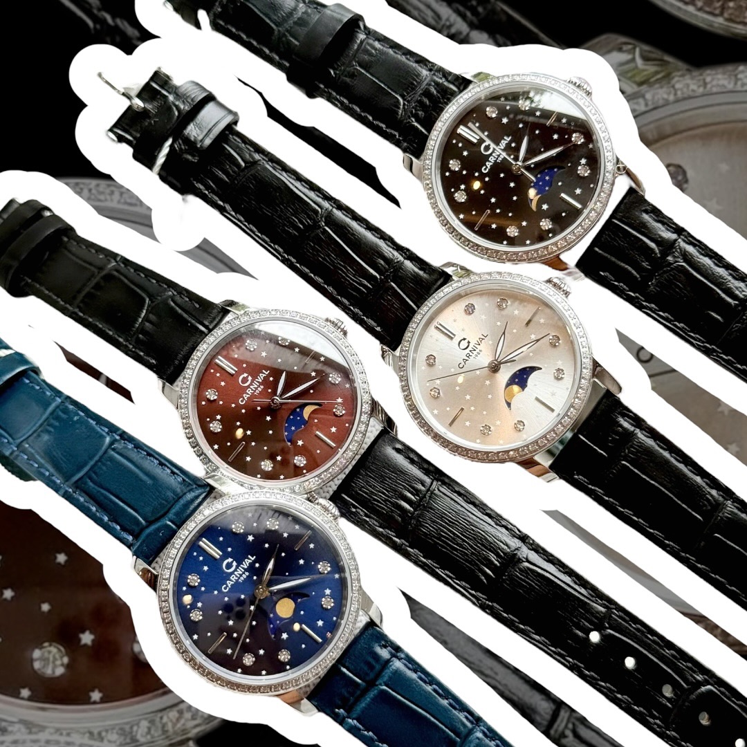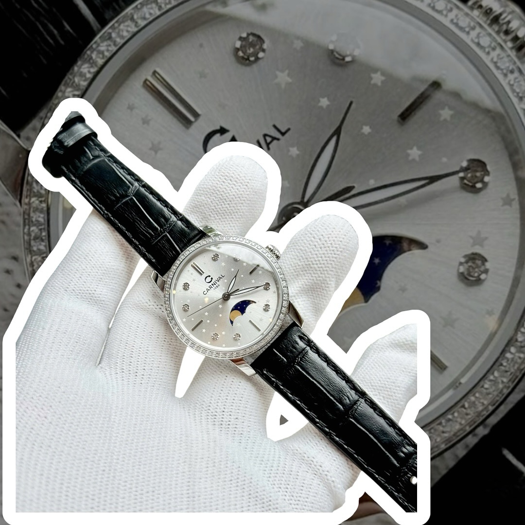 CARNIVAL 8193L2 DIAMOND SILVER MOONPHASE WHITE FACE LEATHER